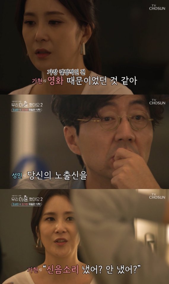 결혼 20년 차에 조성민의 허락 후 찍은 영화가 노출 장면들이 꽤 있었고, 영화를 찍는 동안 조성민은 '오늘은 무슨 장면 찍었어?', '리딩할 때도 신음소리 냈어? 안 냈어?'라고 물어봤던 것이다. 장가현은 조성민이 혼자 자신이 찍은 영화를 보고 왔던 날을 떠올리며 "야동 보고 온 남자가 나 건드리는 것처럼 너무 기분 나쁜 거야. 나에 대해서 존중을 안 해주는 느낌이었어"라고 눈물을 펑펑 흘렸다.