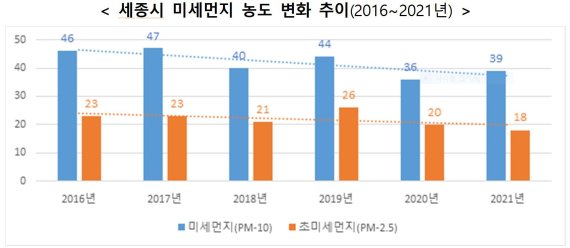 16일 세종시에 따르면 세종 지역의 초미세먼지 농도는 2019년에는 전국 평균보다 13.0% 높았지만, 2020년에는 격차가 5.3%로 낮아지는 등 점차 개선돼 지난해에는 전국 평균과 같은 수치로 나타났다.