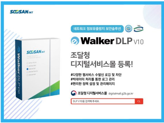 【서울=뉴시스】송종호 기자 = 정보보안 기업 수산아이앤티는 네트워크 정보유출방지 보안솔루션 '이워커 DLP V10'을 조달청 디지털서비스몰에 등록했다고 13일 밝혔다.