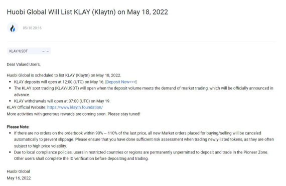 17일 후오비글로벌은 공지사항을 통해 오는 18일 클레이튼을 상장한다고 밝혔다. 클레이 입금은 지난 16일 오후 9시(한국시간)부터 지원되기 시작했으며, 출금은 오는 19일 오후 4시(한국시간)부터 시작된다.