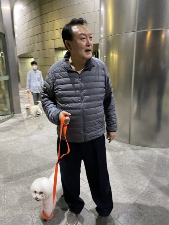 (서울=뉴스1) 김일창 기자 = 윤석열 대통령이 늦은 저녁 자택 앞에서 반려견과 산책하려 나서는 사진이 17일 인터넷 커뮤니티에 올라왔다.