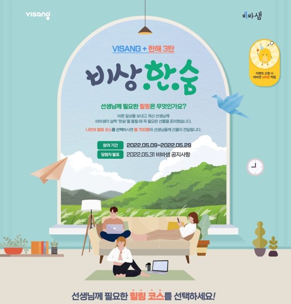 비바샘은 당첨자에게 힐링 코스에 걸맞은 맞춤형 선물을 증정한다. 이벤트는 오는 29일까지 진행된다.