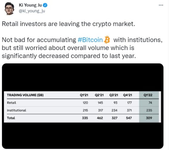 그는 또한 해당 주주서한 내용 중 "2022년 1분기 코인베이스 거래량의 76%가 기관 투자자로부터 발생했다"라고 덧붙였다.