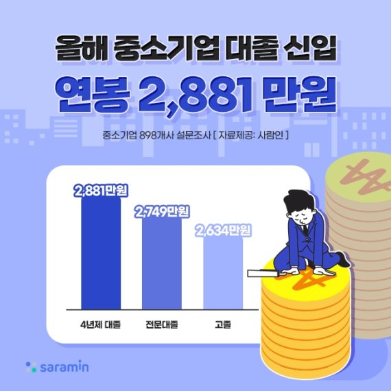 취업플랫폼 사람인은 중소기업 기업 898개사를 대상으로 올해 신입사원 연봉 현황을 조사, 18일 그 결과를 공개했다.