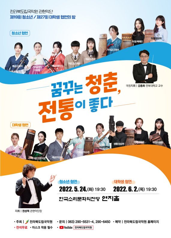 제19회 청소년 협연의 밤은 강종화 전북대 교수가 객원지휘로 참여한다. 전통 음악에 대한 새로운 해석과 다양한 선율 전개로 패기 넘치는 무대를 선보일 예정이다. 올해로 27번째를 맞는 대학생 협연의 밤은 젊은 예인들과 함께 전통과 현대가 조화를 이루는 설렘 가득한 무대로 준비됐다.