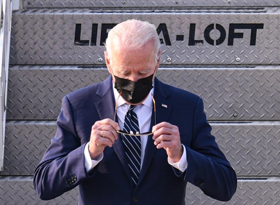 바이든 대통령은 이날 오후 5시 22분께 검정 마스크를 쓴 채 전용기 에어포스 원에서 내려 박진 외교부 장관의 영접을 받았다.