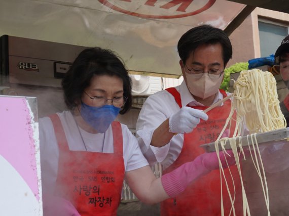 김 후보는 이날 낮 12시 경기 의왕시 한 아파트에서 어르신들을 위한 짜장면 나눔 봉사활동에 참여했다. 이날 봉사활동은 정 여사의 제안으로 이뤄졌다. 매주 토요일 경기도 전역에서 봉사활동에 참여하는 정 여사는 2주 전에도 '사랑의 짜장차'에서 시민들에게 짜장면을 나눴다.