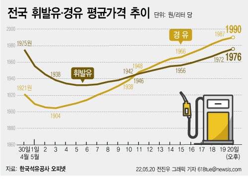 22일 한국석유공사 유가정보서비스 오피넷에 따르면 20일 오후 기준 리터(ℓ)당 전국 경유 평균 판매 가격은 전일 대비 4.23원 오른 1990.99원, 휘발유 가격은 5.28원 오른 1977.39원을 기록했다.