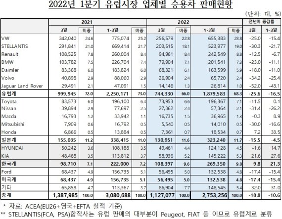 유럽시장의 경우 반도체 공급난과 우크라이나 사태까지 겹치면서 부품 공급난 등으로 이어지며 자동차 판매가 급감했지만 국산브랜드는 21.3% 증가했다.
