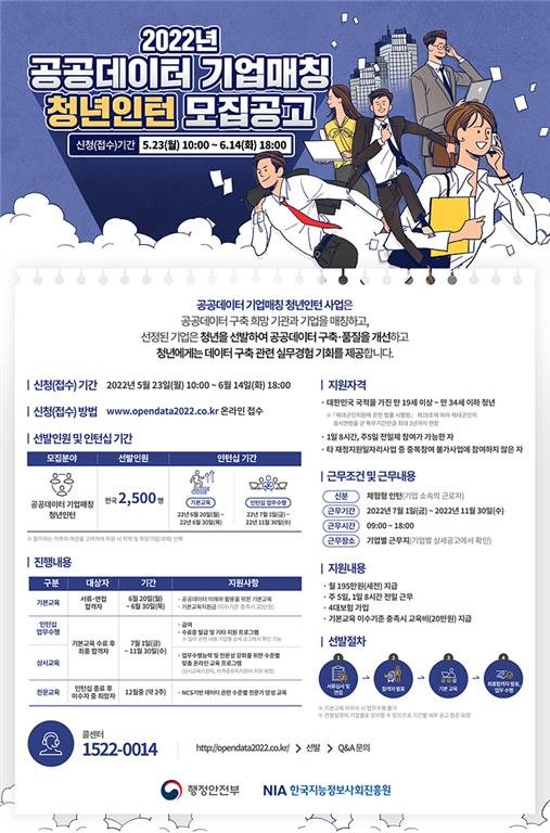 [파이낸셜뉴스] 한국지능정보사회진흥원(NIA)은 23일부터 6월 14일까지 '2022년 공공데이터 기업매칭 청년인턴' 2500명을 모집한다. 청년인턴은 공공데이터 개방, 품질진단 및 개선, 실측 등 업무를 수행하며 7월 1일부터 11월 30일까지 월급 195만원(세전)을 지급받는다.