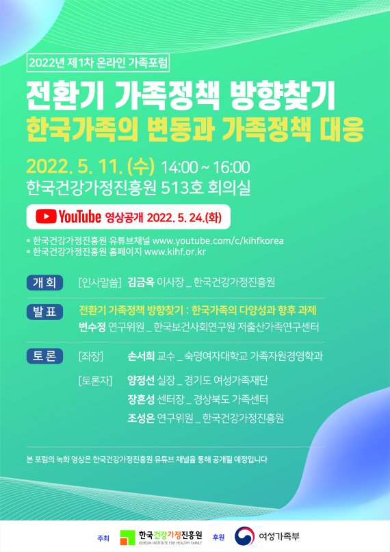 [파이낸셜뉴스] 여성가족부 산하 한국건강가정진흥원은 '2022년 제1차 온라인 가족포럼'을 24일 공식 유튜브 채널에 공개한다.