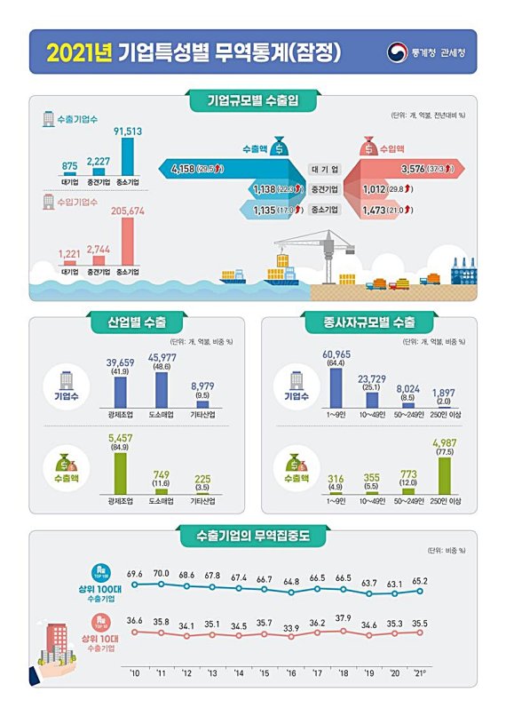 하지만 이들의 수출액은 대기업 4158억 달러(전년 대비 29.5% 증), 중견기업 1138억 달러(22.3% 증), 중소기업 1135억 달러(17% 증) 등 총 6431억 달러를 기록, 전년보다 25.8%가 증가했다.