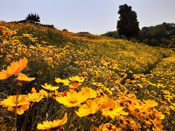 [순천=뉴시스] 김석훈 기자 = 전남 순천시의 유명 관광지인 순천드라마촬영장 주변에 만개한 황금빛 금계국 군락이 형성돼 관광객의 시선을 끌고 있다.