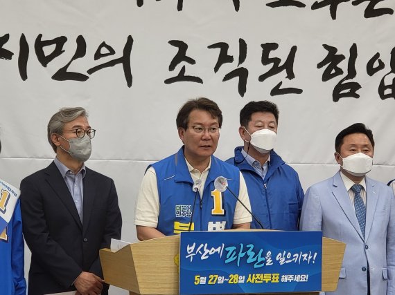 이날 기자회견에는 변 후보를 비롯해 박재호·전재수·최인호 의원 등 당 간부 10여명이 참여했다.
