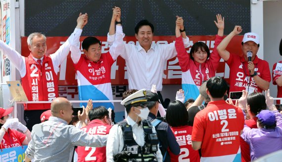 한편 26일 기준 한국사회여론연구소(KSOI)가 헤럴드경제 의뢰로 지난 23~24일 이틀간 실시한 서울 25개 구청장 여론조사 결과에 따르면 국민의힘은 10곳에서 오차범위 밖 우세를 달렸고, 12곳에서도 오차범위 내에서 앞섰다.