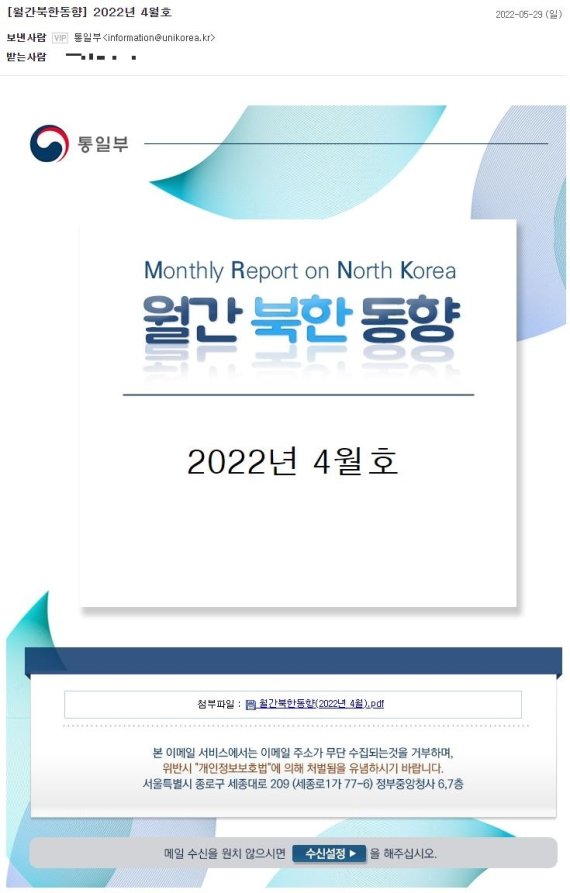 해커는 이날 대북 분야 종사자들에게 '[월간북한동향] 2022년 4월호'라는 제목의 해킹 메일을 전송했다. 메일에는 실제로 통일부가 사용하는 로고가 삽입됐다. 또 메일 본문 하단에는 '월간북한동향(2022년 4월).PDF'라는 짧은 글이 쓰여 있다.