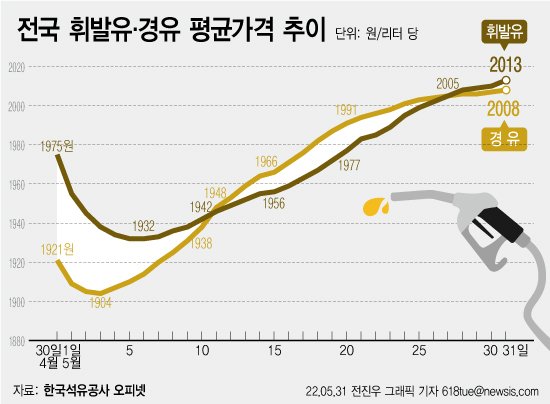 경유 가격이 지난 24일 휘발유보다 먼저 ℓ당 2000원대에 진입한 데 이어 같은달 31일에는 휘발유 가격이 ℓ당 2010원을 넘어섰다.