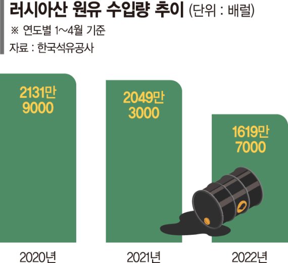 국내 정유사들은 러시아산 원유를 대체하기 위해 미국·중동산 원유 수입을 늘린 것으로 확인됐다. 올해 4월 미국산 원유 수입량은 1141만배럴로 지난해 같은 기간보다 23.8% 증가했다. 같은 달 아랍에미리트(UAE)산 원유 수입량도 596만3000배럴로 전년 동기 대비 51.4% 늘었다. 이라크산 원유 수입량은 649만배럴로 전년 대비 2.5%, 쿠웨이트산 원유 수입량은 1037만배럴로 전년 동기 대비 5.4% 각각 증가했다.