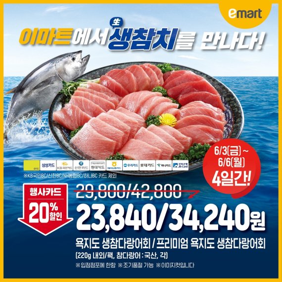 최관용 이마트 참치회 바이어는 "이마트가 횟감 중 최고라고 불리는 국산 생물 참다랑어를 사전기획을 통해 대량으로 확보해 저렴한 가격으로 선보이게 됐다"며 "앞으로도 고객 장바구니 부담을 줄이기 위해 노력하겠다"고 말했다.