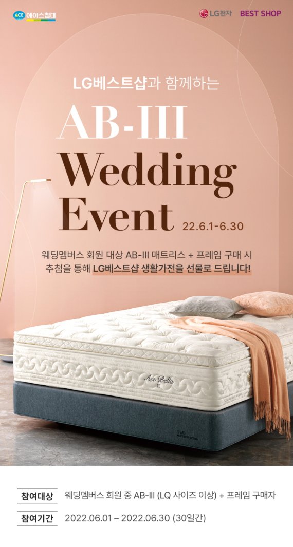 ▲에이스침대는 신혼부부 멤버십 제도 '에이스 웨딩멤버스' 혜택은 물론 LG 생활가전 경품을 지급하는 LG 베스트샵 제휴 프로모션을 30일까지 진행한다. 웨딩멤버스 가입 후 에이스 벨라-Ⅲ 라지퀸 사이즈 이상 매트리스와 침대 프레임을 함께 구매하면 참여할 수 있다. 에이스침대는 추첨을 통해 1등 이동식 TV 'LG 스탠바이미', 2등 'LG 휘센 제습기', 3등 'LG 엑스붐 GO' 등 총 15명에게 인기 LG생활가전을 증정한다.