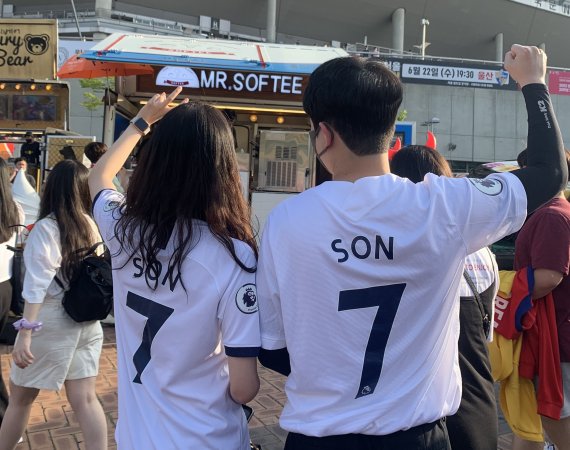 붉은색 국가대표 유니폼이 경기장 광장을 대부분 메운 가운데 가장 눈에 띄는 유니폼은 손흥민의 등번호 7번이 적힌 셔츠였다.