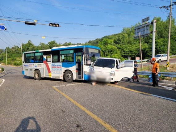 (충북ㆍ세종=뉴스1) 조영석 기자 = 3일 오후 5시19분쯤 충북 영동군 심천면 구탄리 인근 도로 교차로에서 옥천 시내버스와 화물차가 충돌해 화물차에 타고 있던 6명이 다쳐 인근 병원으로 이송됐다.