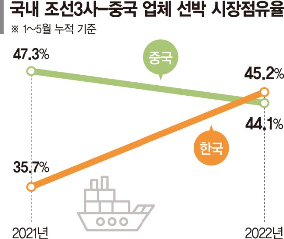 4월까지만 해도 올들어 누적 점유율에서 중국과 동률을 이뤘던 국내 조선3사는 5개월 만에 1위 자리를 탈환했다.
