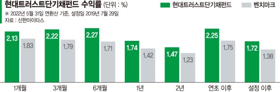 5일 신한아이타스에 따르면 지난 5월 31일 기준 현대트러스트단기채 펀드의 1년 연환산 수익률은 1.74%다. 벤치마크(BM) 1.42%를 0.32%p 상회했다.