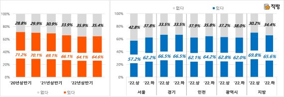 이는 직방이 2020년 관련 조사를 시작한 이후 2년 6개월 만에 응답비율이 상승 전환된 것으로 거주 지역별로는 경기(66.5%)와 지방(65.6%), 인천(64.2%), 서울(62.2%), 5대광역시(62.0%) 순으로 매입 의사 응답 비율이 높게 나타났다. 지난해 말 조사와 비교했을 때 서울(5.0%p)과 인천(2.1%p) 거주자의 주택 매입 의사가 있다는 응답 비율이 증가했다.