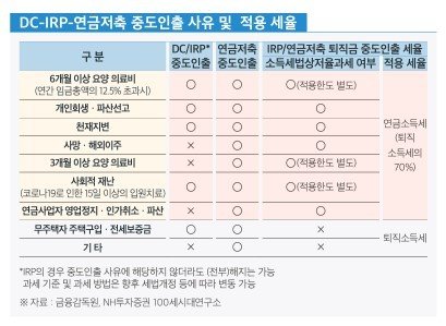 반면 IRP·연금저축은 6개월이상 요양 의료비, 개인회생 등 소득세법상 부득이한 사유에 해당할 경우 퇴직소득세의 70%인 연금소득세가 적용된다.