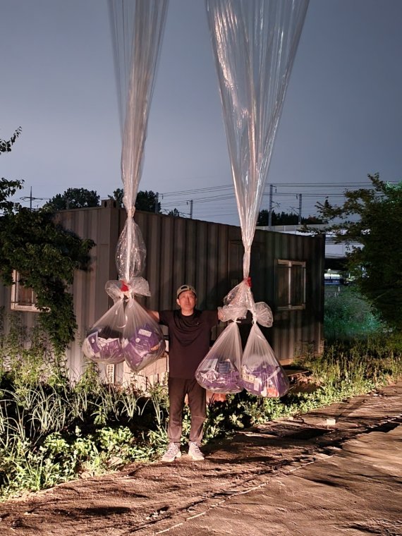 (포천=뉴스1) 박대준 기자 = 대표적인 대북전단 살포 단체인 ‘자유북한운동연합’(대표 박상학)이 윤석열 정부 출범 이후 처음으로 북한의 코로나19 사태와 관련 의약품을 북으로 날려 보냈다.