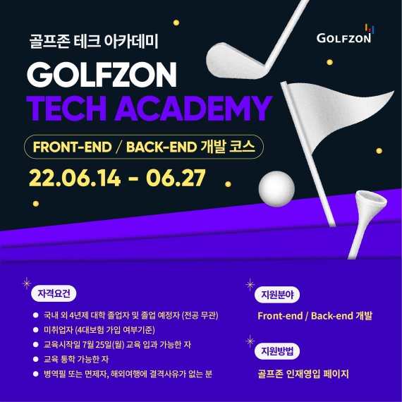골프존 테크 아카데미는 이론, 실습, 실무 프로젝트를 통해 골퍼를 위한 종합 플랫폼의 개발자를 양성하는 아카데미로 이번 모집 분야는 프론트엔드(Front-end) 개발과 백엔드(Back-end) 개발 두 가지다.
