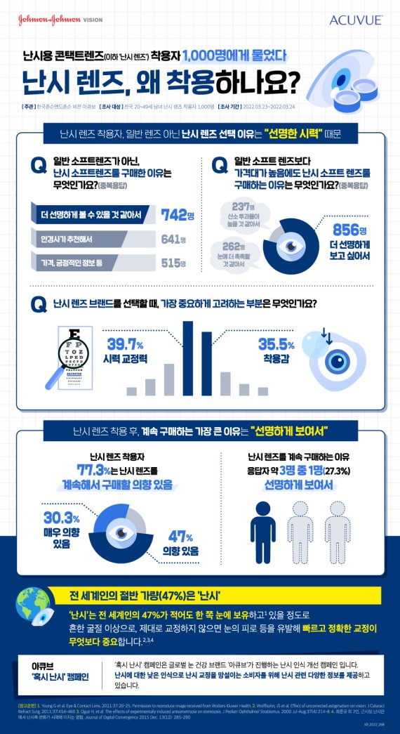 [파이낸셜뉴스] 한국존슨앤드존슨 비젼 아큐브가 난시용 콘택트렌즈를 착용한 20~49세 성인 남녀 1000명을 대상으로 진행한 설문 조사 결과를 8일 발표했다. 소비자들이 난시 렌즈를 구매하는 가장 큰 이유는 ‘선명한 시력을 위해서(74.2%, 중복응답)’였으며, 일반 렌즈 대비 높은 가격에도 불구하고 난시 렌즈를 구매하는 이유 역시 ‘더 선명하게 보고 싶어서(85.6%)’가 가장 높은 비중을 차지하는 것으로 나타났다.