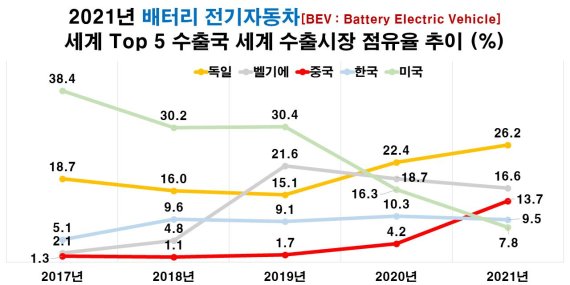 반면 한국은 2020년까지만 해도 중국에 이어 2위 국가였으나 지난해는 4위까지 밀려났다. 5위 헝가리(6.4%)와 격차는 2.4%p에 불과하다.