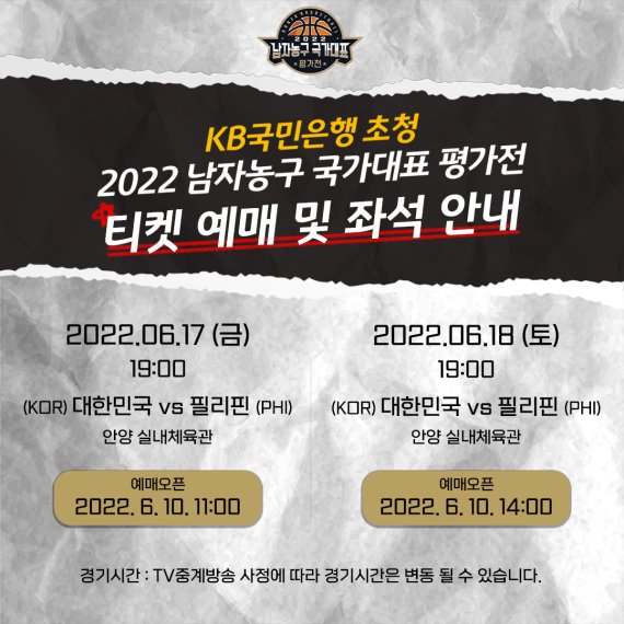 대한민국농구협회는 오는 10일 오전 11시부터 17~18일 양일간 안양실내체육관에서 열리는 필리핀과 평가전 입장권 예매를 시작한다고 전했다.