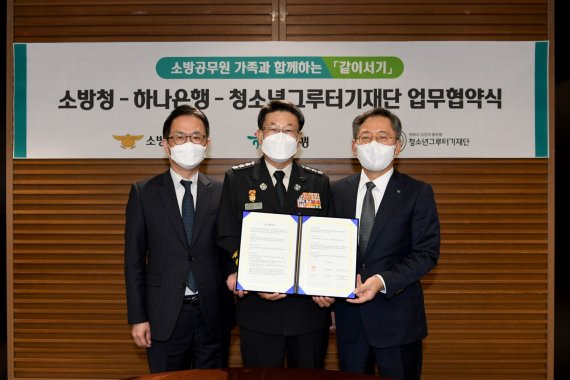 [파이낸셜뉴스] 소방청은 9일 하나은행, 청소년그루터기재단과 소방공무원 복지 지원을 위한 업무협약을 체결했다.