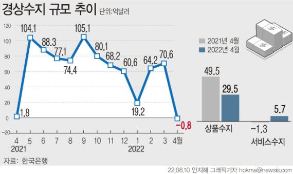 문제는 유가가 급등하고 있어 상품수지 흑자폭이 줄어들고 있다는 점이다. 상품수지 흑자폭은 3월과 4월 각각 25억4000만 달러, 20억 달러 축소됐다. 경상수지의 대부분을 차지하고 있는 상품수지 흑자폭이 줄어들 경우 적자 우려가 더 높아질 수 있다.