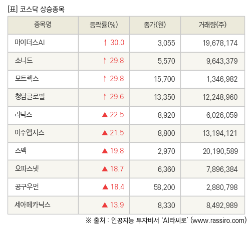[fnRASSI]장마감, 코스닥 상승 종목(마이더스AI 30.0% ↑)