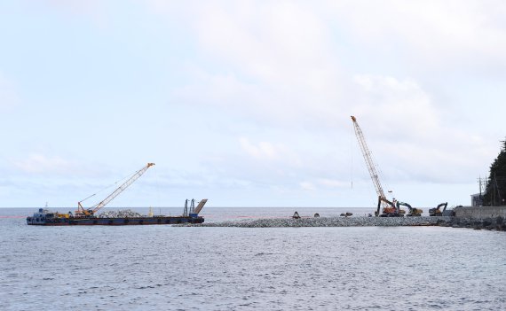 이날 국토교통부에 따르면 울릉공항은 바다를 매립해 짓는 해상매립공항이다. 50인승 항공기가 오가는 1.2㎞ 활주로(사석경사제 364m+케이슨혼성제 987m)가 지어진다. 건설현장에는 배 두 척이 떠있었다. 활주로 첫 머리가 될 사석경사제 부분은 돌덩이를 쌓는 작업이 한참이었다. 포크레인이 빠지선에 실린 암석을 쌓아 방파제를 만들고 있었다. 그 옆으로 방파제 역할을 하는 콘크리트 해상구조물인 케이슨 1개가 놓여있었다. 네모난 모양이라 바다 한가운데 거대한 바둑판이 있는 모양새였다.