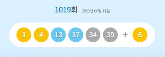 이번 로또 복권 1등 당첨 번호는 '1, 4, 13, 17, 34, 39'다. 2등 보너스 번호는 '6'이다.