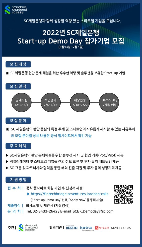 [파이낸셜뉴스] SC제일은행은 다음달 1일까지 '2022년 SC제일은행 스타트업 데모데이'에 참여할 스타트업 기업을 모집한다고 13일 밝혔다.
