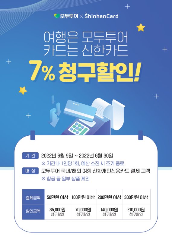 우선 신한카드와 오는 30일까지 청구할인 이벤트를 진행한다. 국내·해외여행 상품, 호텔을 예약하고 기간 내 신한카드로 결제한 고객 대상으로 결제액의 7% 청구 할인 혜택을 제공한다.