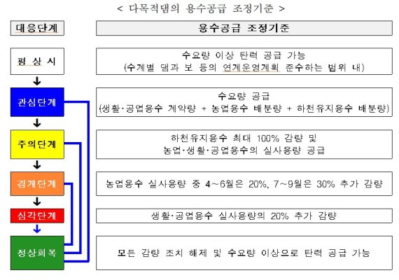 환경부는 비가 부족하게 내려도 용수 공급에 지장이 발생하지 않도록 댐의 용수공급량을 단계별로 관리하고 있다. 다목적댐은 '관심'-'주의'-'경계'-'심각' 4단계, 용수댐은 '관심'-'주의'-'심각' 3단계다.
