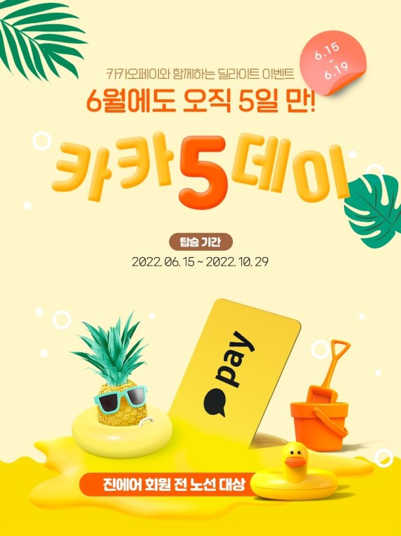 6월의 카카5데이는 6월 15일부터 10월 29일 사이에 운항하는 국내선, 국제선 항공편을 대상으로 진행된다. 카카오페이 이용 고객이면 누구나 진에어 홈페이지 및 모바일 웹, 앱을 통해 항공권 예매 시 할인 혜택을 누릴 수 있다.