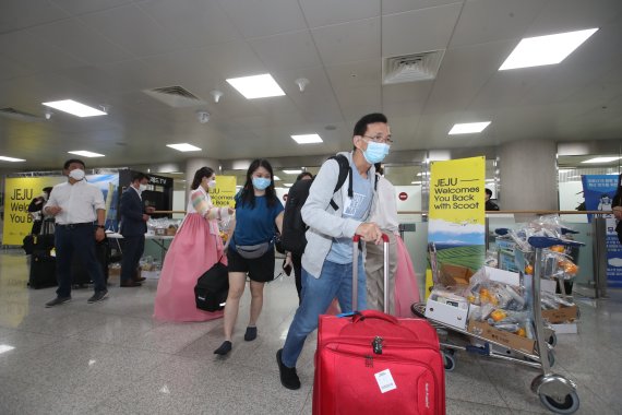 15일 오전 제주국제공항 1층 국제선 도착장에 싱가포르 창이국제공항을 이륙해 제주에 도착한 스쿠트항공기 TR812을 이용한 외국인 관광객들이 들어섰다.
