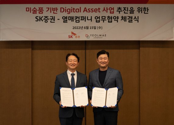 [서울=뉴시스]신항섭 기자 = SK증권은 미술품 공동구매 서비스 기업 '열매컴퍼니'와 업무협약(MOU)을 맺고, 미술품 기반 디지털 에셋(Digital Asset) 사업 추진을 위해 상호 협력할 예정이라고 15일 밝혔다.