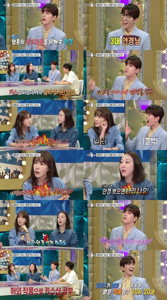 이에 양세형은 "안경으로 유명한 분들이 있다"라며 배용준, 박신양 다음으로 김민규를 꼽았다. 김민규는 "키스신 리허설을 할 때, 안경이 불편해서 애드리브로 뺐다, 감독님이 괜찮다고 하셨다, 이게 화제가 될 물랐다"라고 밝혔다.