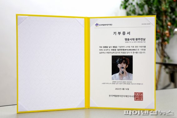 【파이낸셜뉴스=강근주 기자】 가수 임영웅 팬클럽 ‘영웅시대 광주전남’이 16일 1000만원을 한국백혈병어린이재단에 기부했다. 임영웅은 최근 정규앨범 <IM HERO>를 발매하고 전국 콘서트 투어를 진행 중이다.