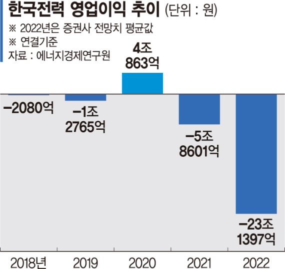 해외 주요국은 연료비 상승에 따른 원가를 반영해 2022년 전기요금을 24.3~68.5% 인상하고 세금감면, 바우처 지급, 전력회사 재정지원 등 부담완화 정책을 시행했다. 우리나라는 전력도매가격(SMP)이 사상 최고 수준을 기록했지만, 원가를 전기요금에 반영하지 못했다. 한전은 올해 약 23조원 적자(2022년도 증권사 전망치 평균값)로 자본잠식에 빠질 우려가 있다.