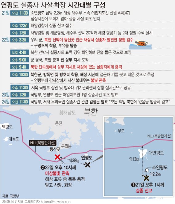 그러던 22일 오후 9시40분께 북한군 단속정이 나타나 상부 지시로 이씨에게 사격을 가했다. 방독면을 착용하고 방호복을 입은 북한군이 해상에 있는 시신에 접근해 기름을 붓고 불태운 정황이 포착됐다. 연평도에 있는 한국군 감시 장비도 시신을 불태우는 불빛을 관측했다.